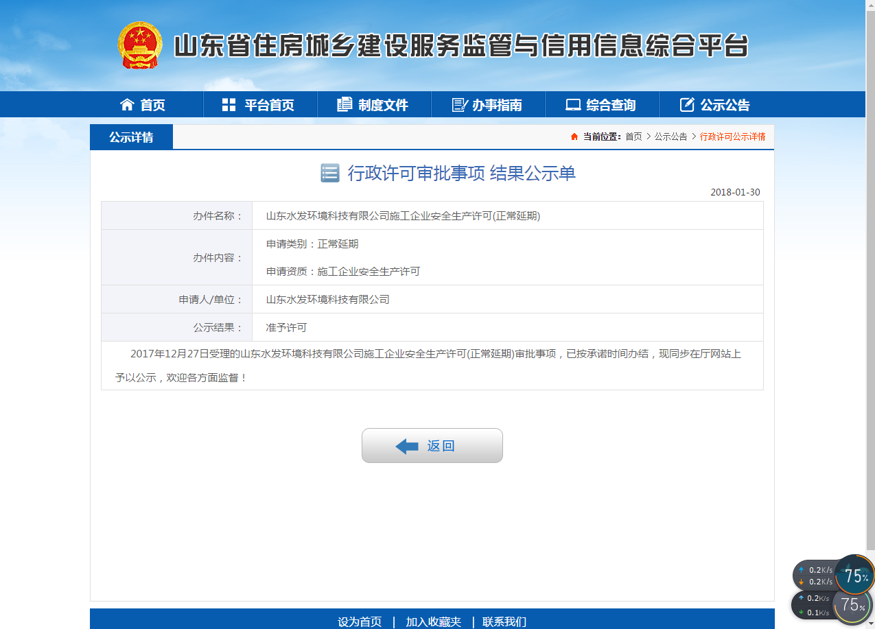 1月30日,山東省住房城鄉建設服務監管與信用信息綜合平臺發布公示,山東水發環境科技有限公司成功獲得2018-2021年山東省施工企業安全生產許可,并于當日進行公示。