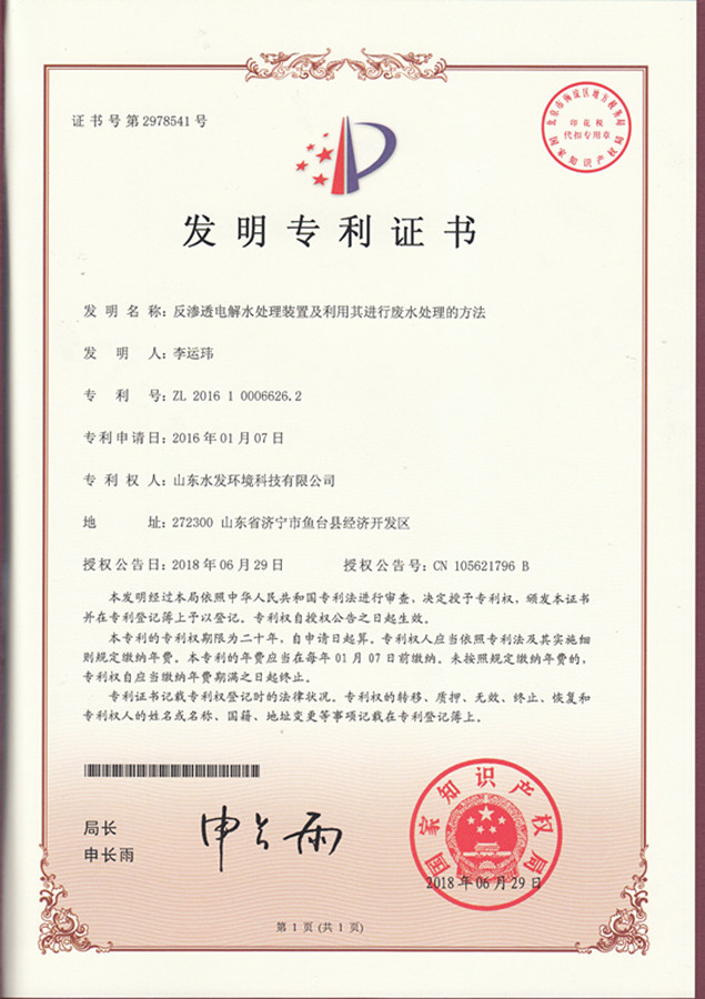 近日,山東水發(fā)環(huán)境科技有限公司自主研發(fā)的《反滲透電解水處理裝置及利用其處理廢水的方法》成功獲國家知識產(chǎn)權(quán)局授權(quán)并頒發(fā)發(fā)明專利證書。