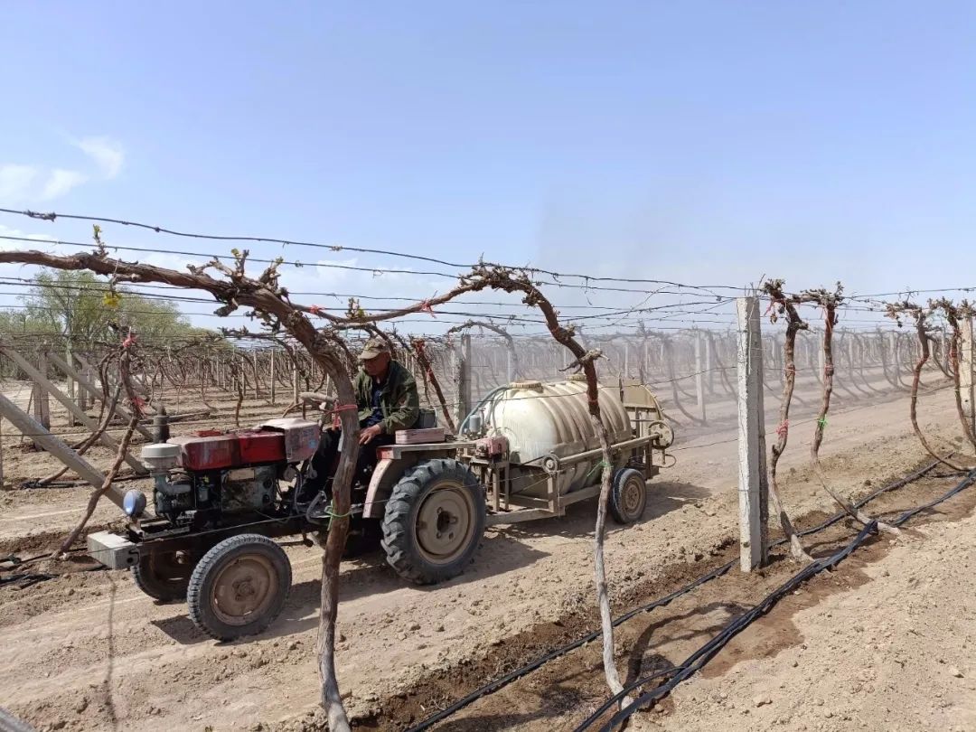 雙河水發(fā)北疆果蔬公司五師雙河市葡萄產(chǎn)業(yè)現(xiàn)代農(nóng)業(yè)示范區(qū)的技術(shù)員仍然戰(zhàn)斗在生產(chǎn)一線,為了確保180畝流轉(zhuǎn)葡萄地的苗木出土后的正常生長,按照公司制定綠色葡萄生產(chǎn)標(biāo)準(zhǔn)化管理規(guī)程相關(guān)要求,公司羅平、何興華等生產(chǎn)技術(shù)人員在調(diào)配農(nóng)藥殺菌劑,采用機(jī)械化的霧化噴施,對已出土的葡萄苗木開展病蟲害集中消殺清理。