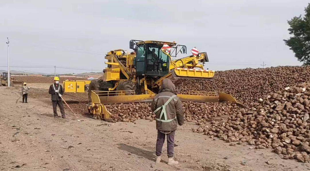 ▲內(nèi)蒙古佰惠生公司將甜菜從地頭拉回公司的堆場(chǎng)后進(jìn)行堆垛,圖中的羅霸機(jī)正在進(jìn)行甜菜的堆垛工作。